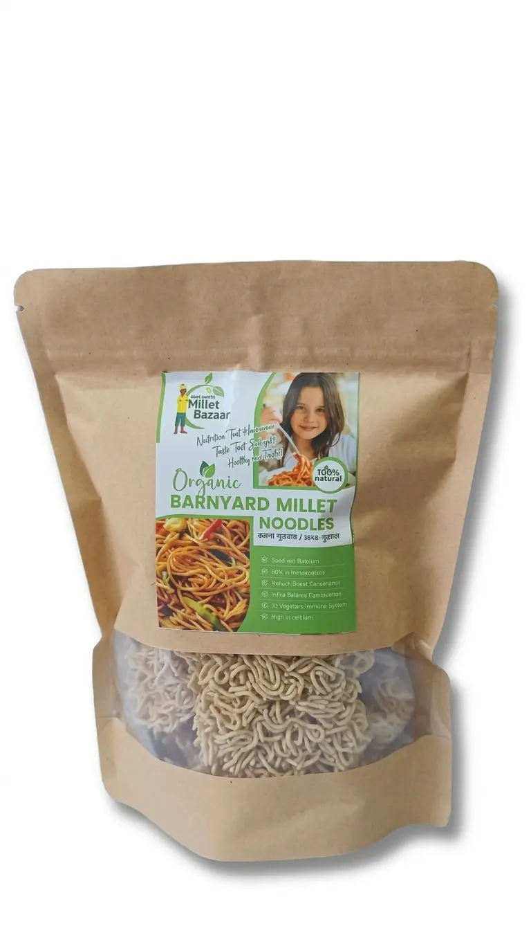 Enjoy Your Favorite Comfort Food with Barnyard Millet Noodles Noodles khane ka maza ab bina kisi pashchatap (guilt) ke! Kisan Bazaar aapke liye laya hai Barnyard Millet Noodles, jo health aur taste ka perfect combination hai. Barnyard millet, jise “Sanwa” bhi kaha jata hai, apne light aur easy-to-digest nature ki wajah se jana jata hai. Agar aap weight watch kar rahe hain, toh ye noodles aapki diet ka sabse behtareen hissa ho sakte hain.