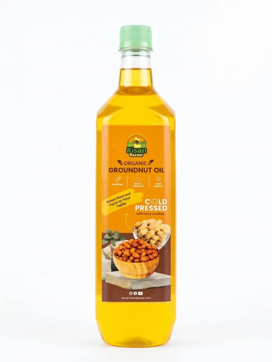Switch to Health: The Purity of Traditional Wood Pressed Groundnut Oil Refined oils ko saaf karne ke liye unhe 200°C se upar garam kiya jata hai aur harmful chemicals dale jate hain. Lekin Kisan Bazaar ka Organic Groundnut Oil bilkul thandi vidhi (Cold Pressed) se nikaala jata hai. Hum sirf desi variety ki moongfali ka istemal karte hain, jise lakdi ki ghani mein dheere-dheere dabaya jata hai taaki tel ka har ek nutrient aur asli swad aapki thali tak pahunche.